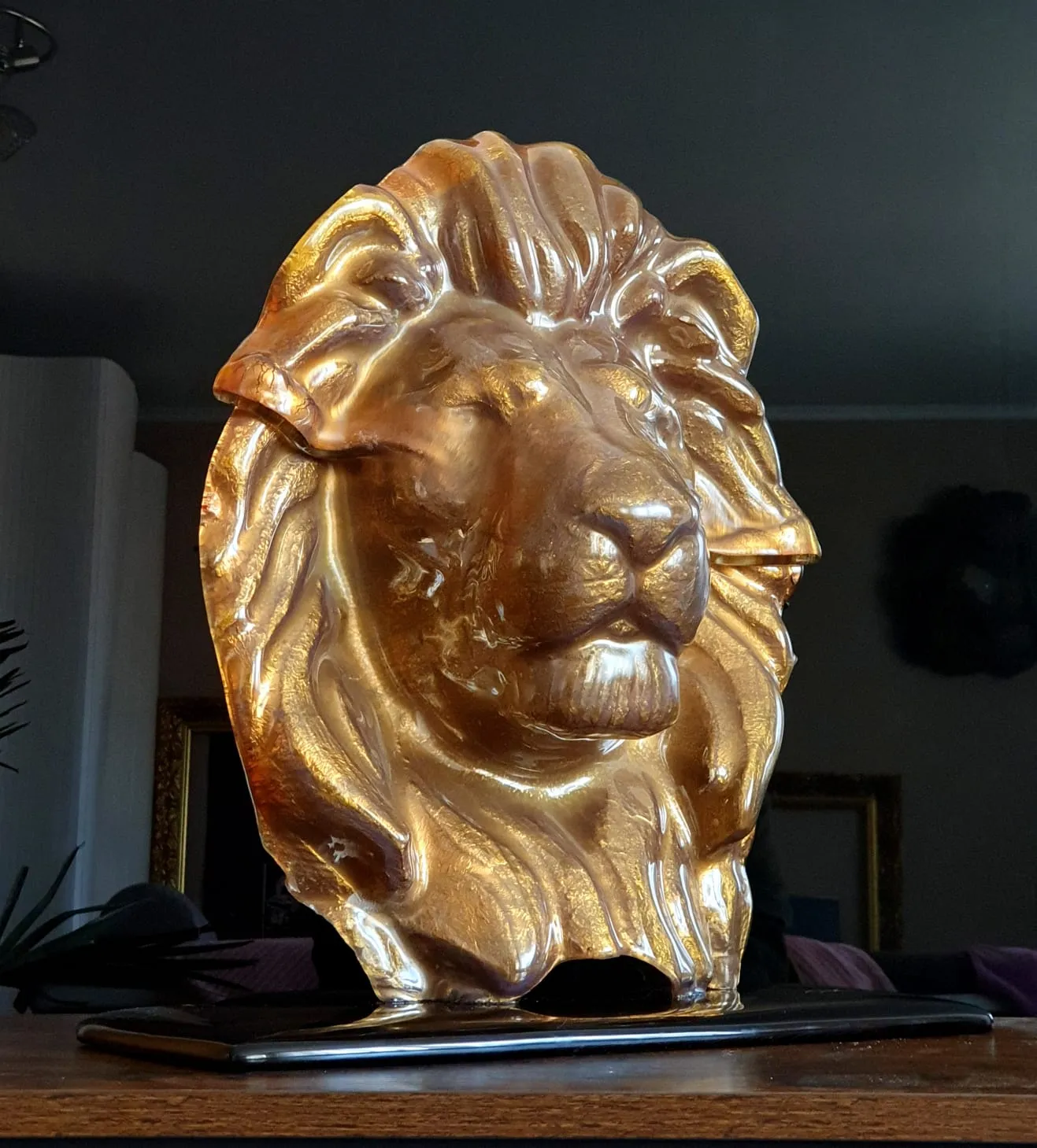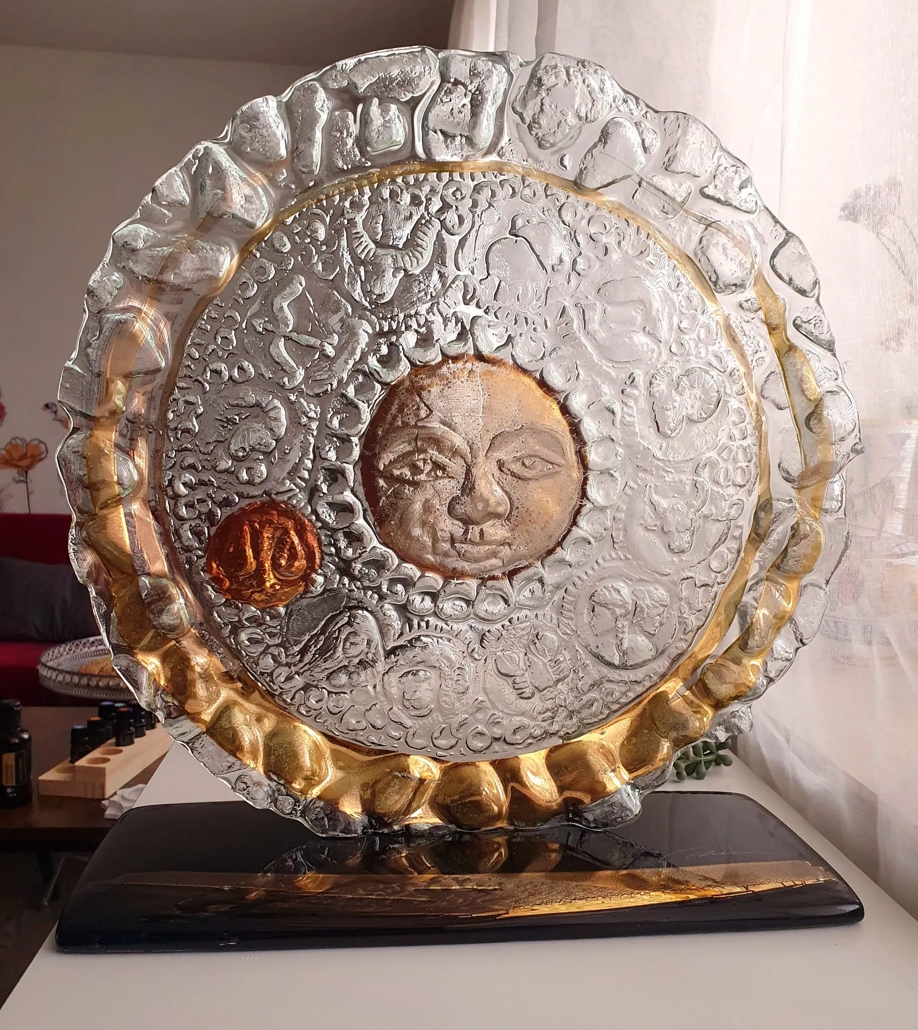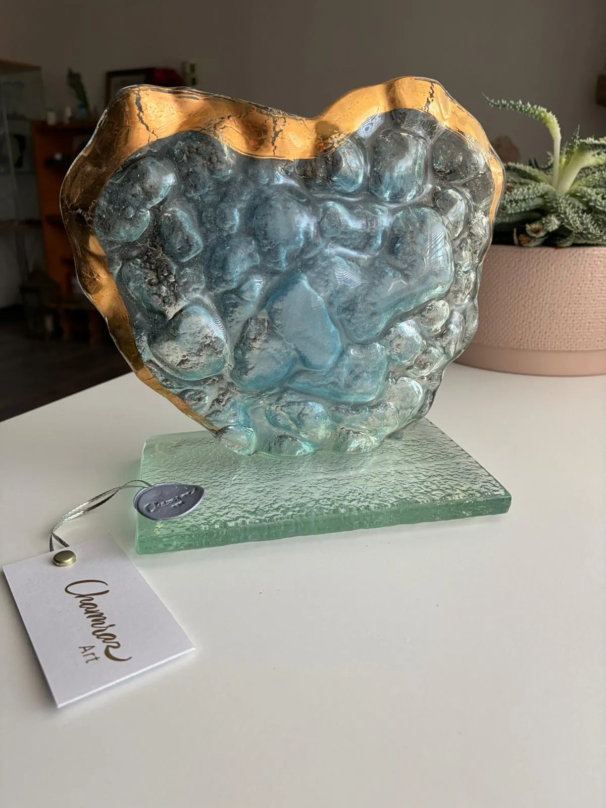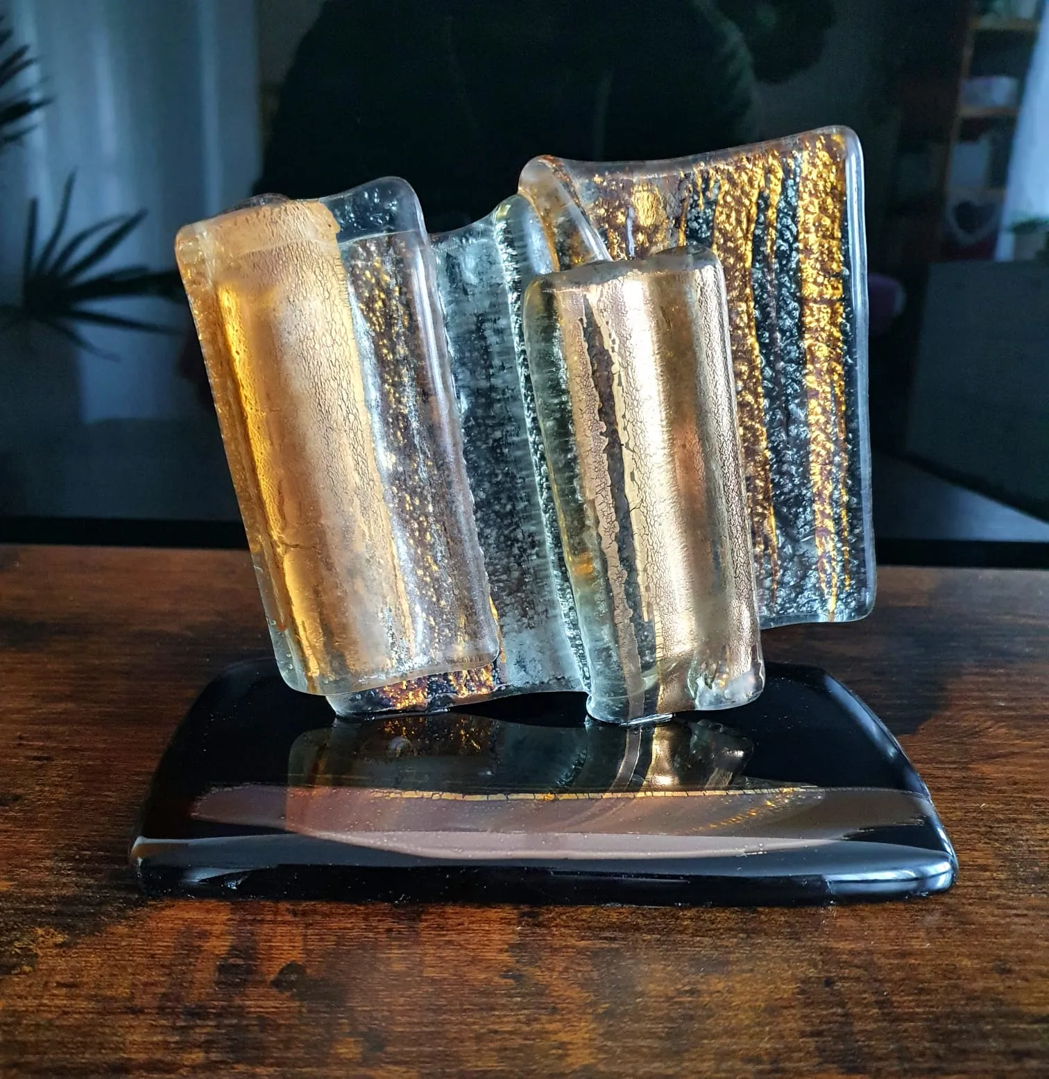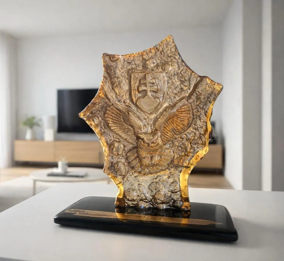 15cm x 15cm x 10cm, zlato a sklo. Toto dielo je predané, ale je možné vytvoriť nové na mieru.