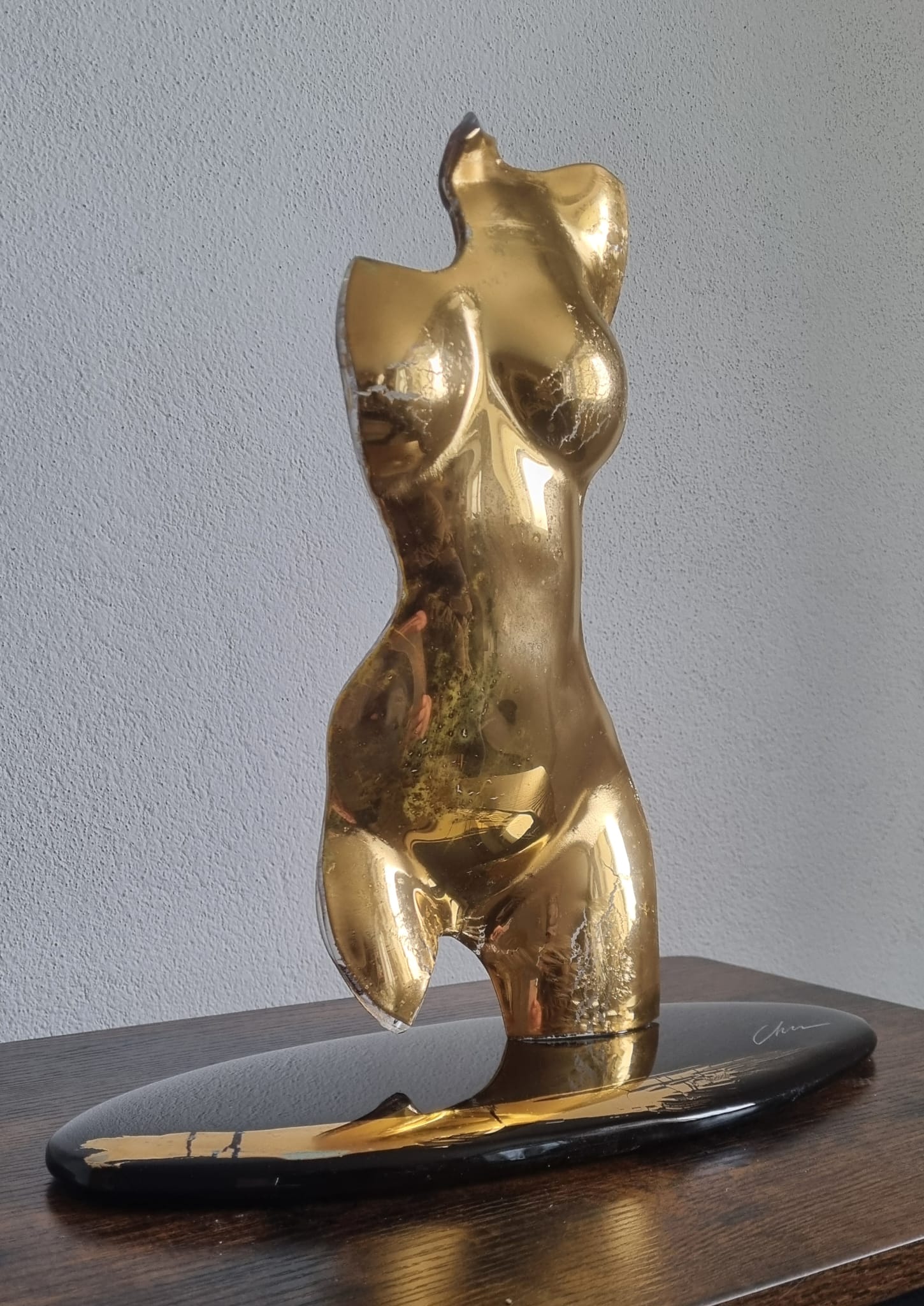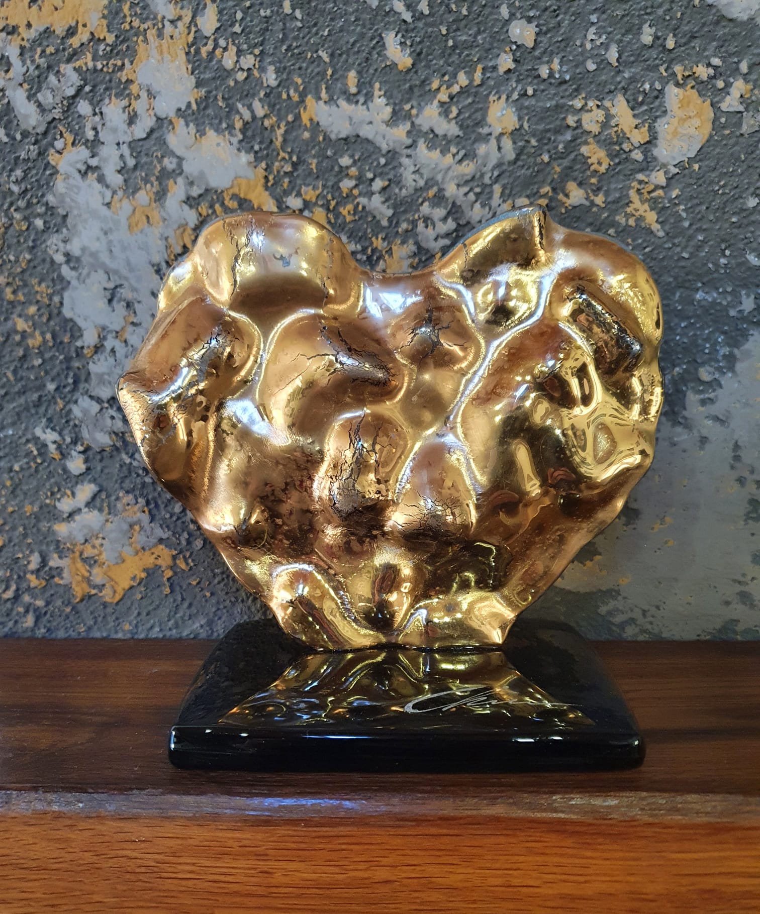 15cm x 15cm x 10cm, zlato a sklo. Toto dielo je predané, ale je možné vytvoriť nové na mieru.